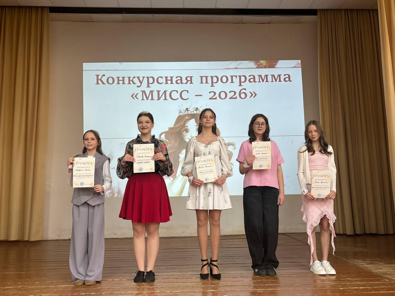 В субботу состоялась традиционная конкурсная программа «Мисс 2026». В мероприятии приняли участие самые смелые и активные представительницы 7-х и 8-х классов. Все участницы показали высокий уровень подготовки и подарили зрителям массу положительных эмоций.