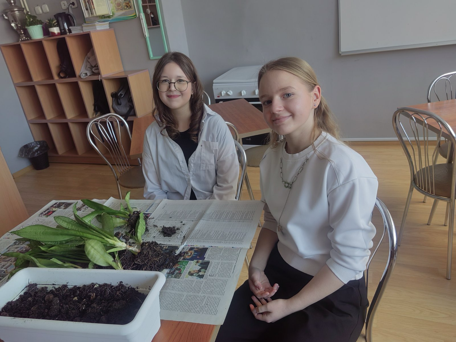 17.01.2026 г в рамках марафона трудового воспитания "Цветущая школа: благоустраиваем вместе" учащиеся VII "Б" и VIII "В" класса занимались пересадкой сансевиерии и фиалок для организации мини-садика в мастерской трудового обучения. Данные растения были выбраны не случайно: фиалки не любят прямые солнечные лучи (окна кабинета выходят на северную сторону), а сенсевиерия - одно из самых популярных декоративно-лиственных растений и относится к суккулентам, которое неприхотливо в уходе.