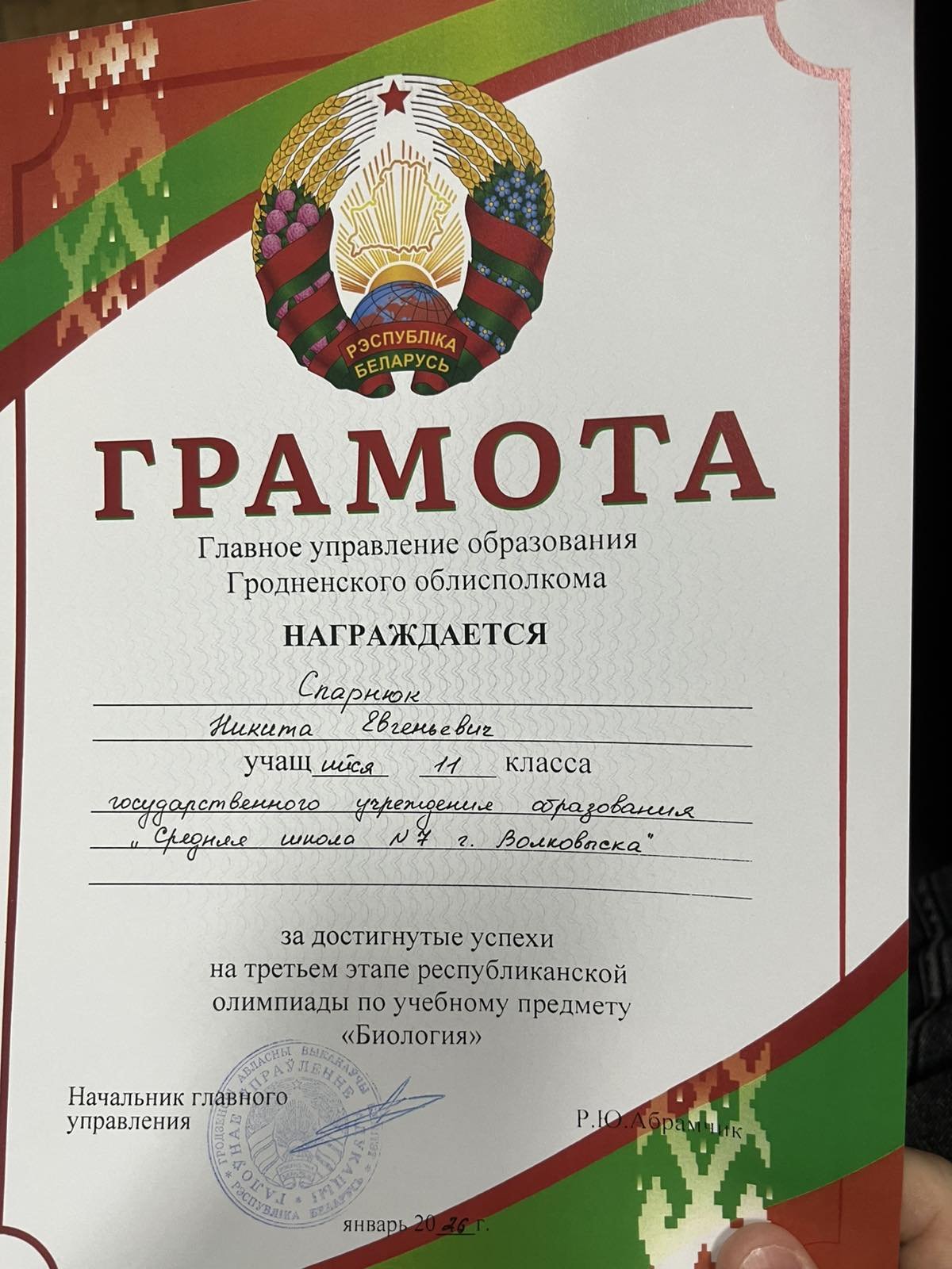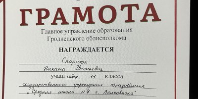 Адамович Полина, учащаяся 6 "Д" класса, Спарнюк Никита, учащийся 11 "Б" класса были награждены Грамотами управления образования Гродненского облисполкома.