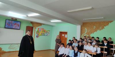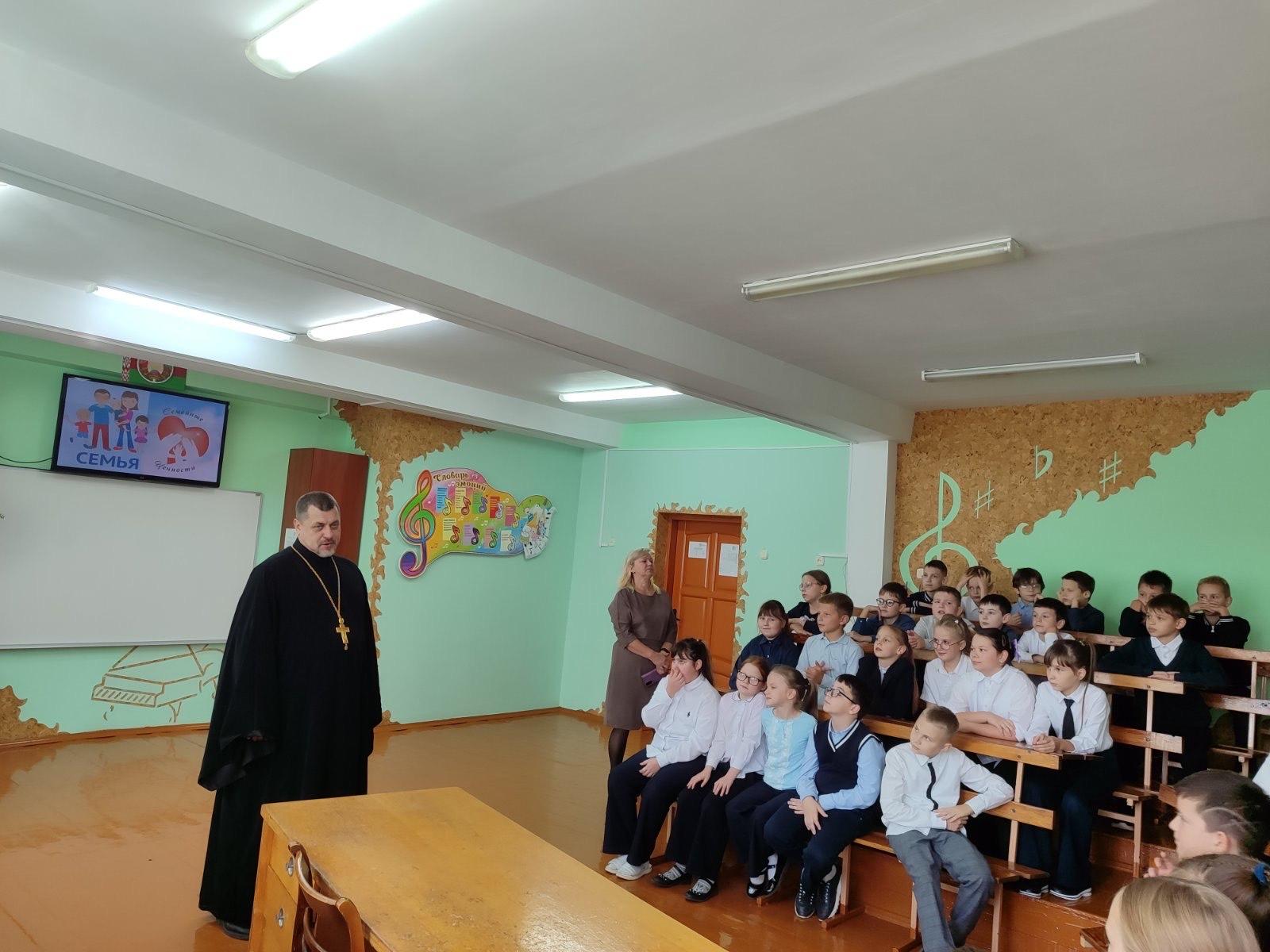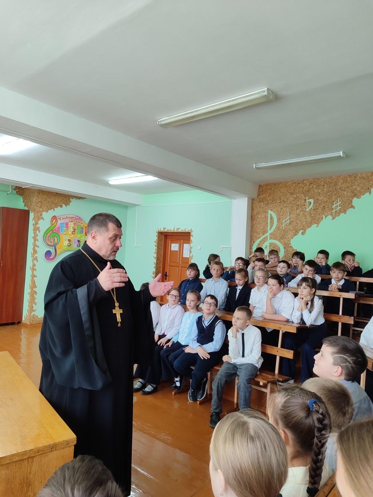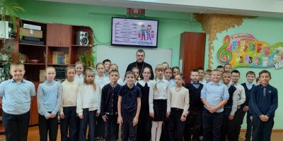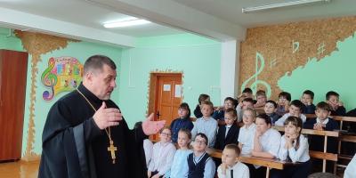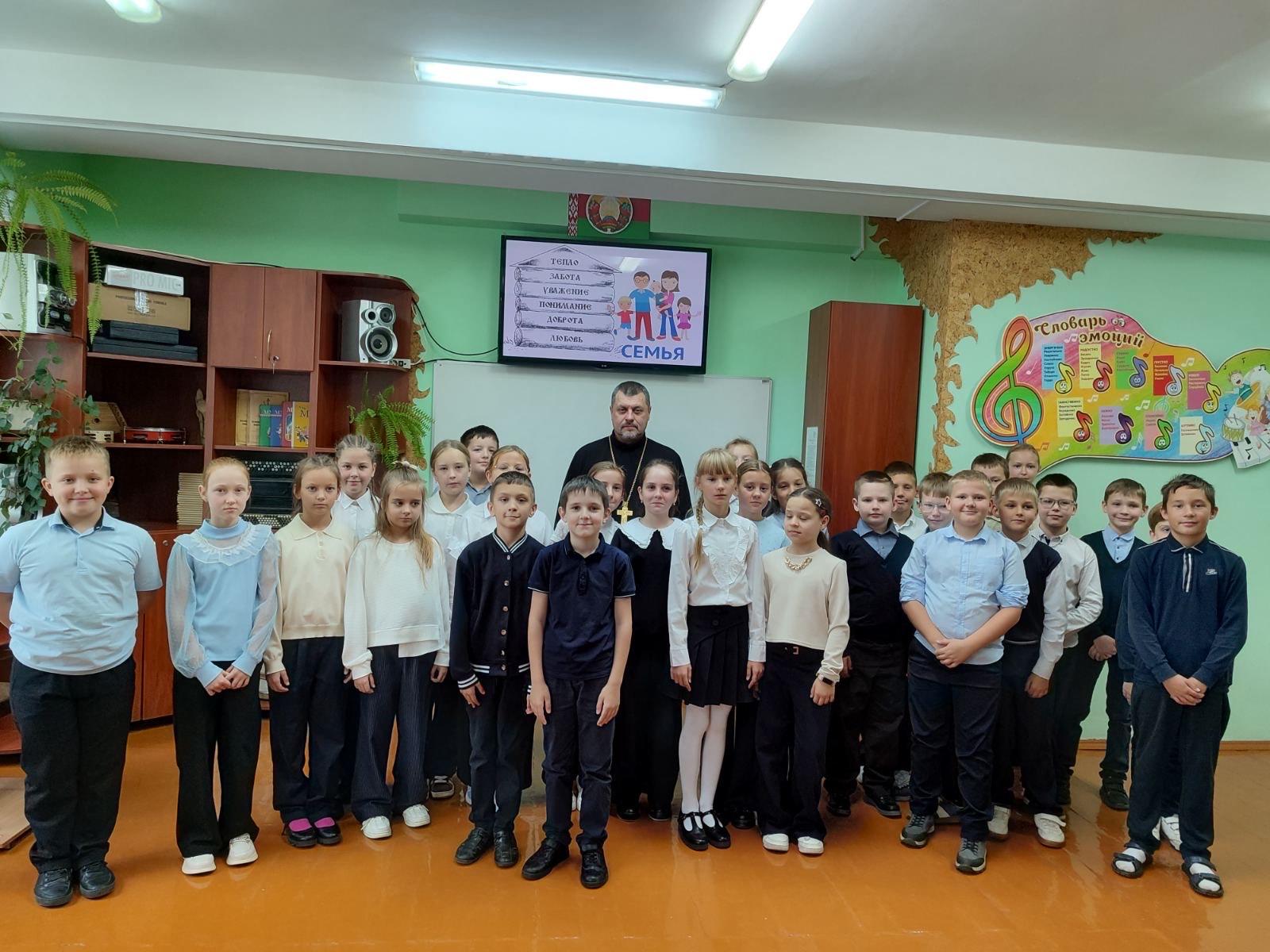 В рамках шестого школьного дня состоялась встреча учащихся 4 - х классов со священником Сергеем Давыдиком. Темой обсуждения стали семейные ценности. Учащиеся принимали активное участие в беседе и отмечали, что в семьях, в которых они воспитываются, отношения строятся на любви, доверии, взаимопомощи, понимании, поддержке друг друга.