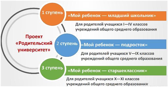 Работа Родительского университета организуется с учётом закономерностей развития ребенка в разные возрастные периоды по трём ступеням: