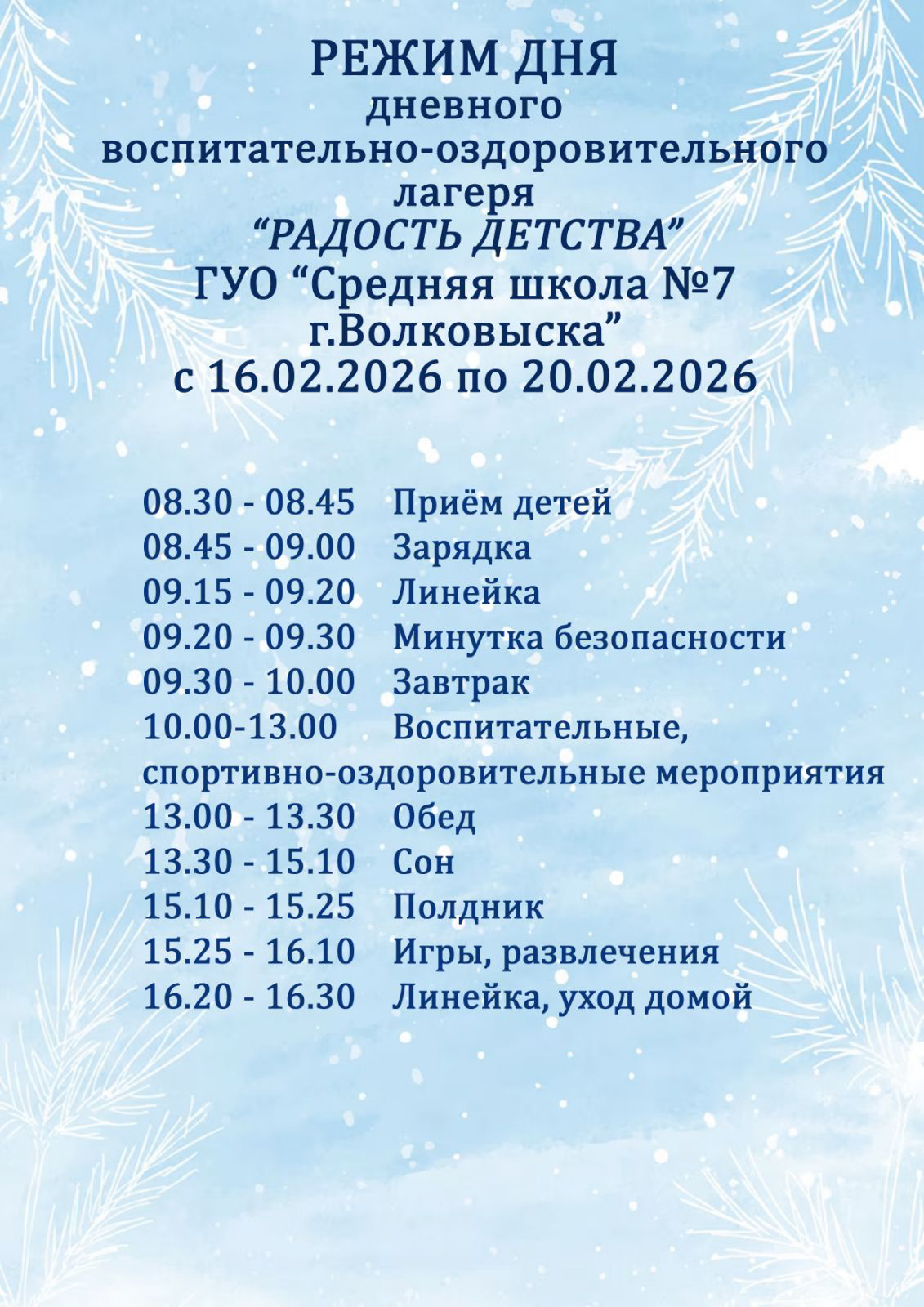 Главная Учащимся Организация оздоровления Дополнительные зимние каникулы 2026 Дополнительные зимние каникулы 2026 С 16 по 20 февраля 2026 года работает школьный лагерь "Радость детства"